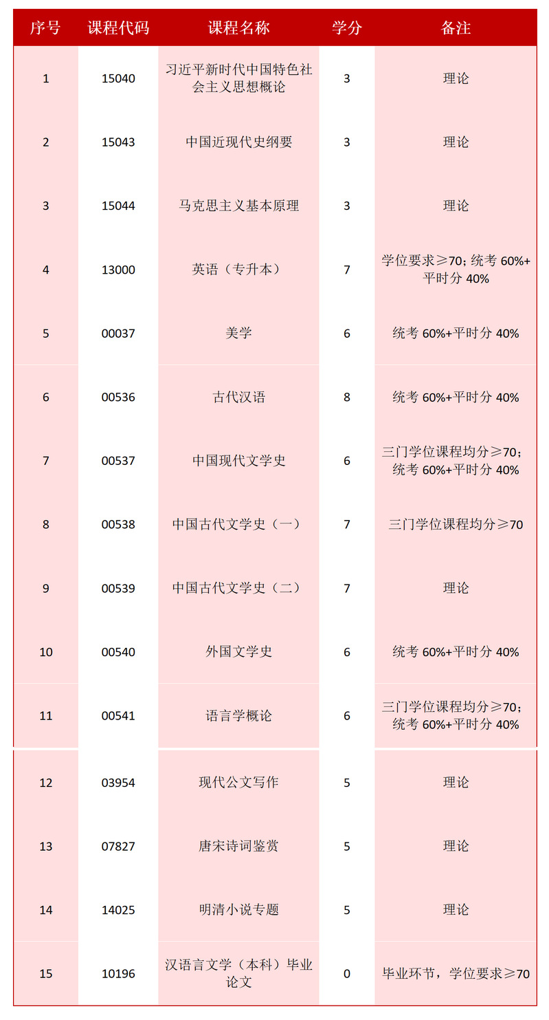 学位课程:中国古代文学史(一)、语言学概论、中国现代文学史。