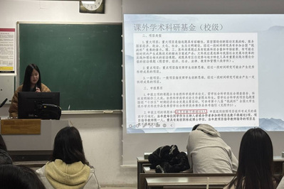 王秉楠开场便提出问题——我们为什么要做科研?她认为科研比考研更有优势。接着,她指出下定决心科研后需要搜集信息,思考我们可做的选题。然后,她结合自身经验,就大创的流程与注意事项进行了详细分析,并提供了建议和技巧。最后,她强调要实现成果多元化,尝试转投其他项目,多面出击。