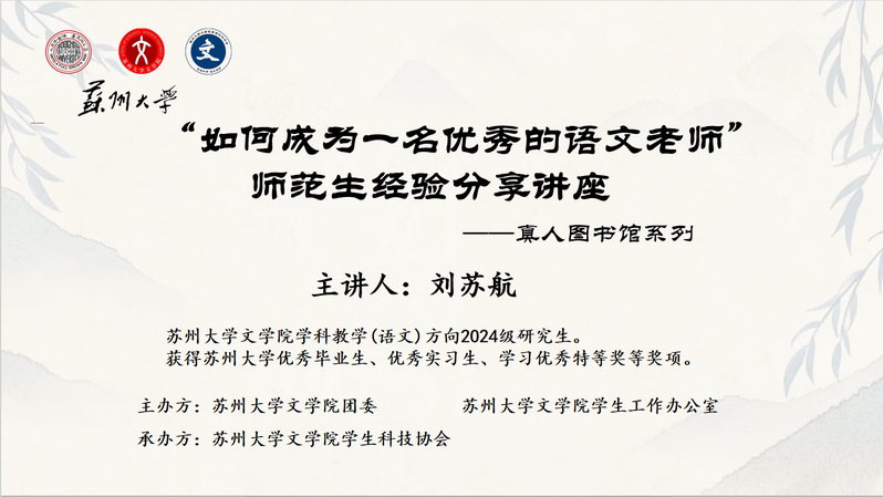 3月6日18:30分,麻豆在线 “真人图书馆”系列活动“如何成为一名优秀的语文老师”师范生经验分享讲座在1001#1103顺利召开。本次活动由麻豆在线 团委、麻豆在线 学生工作办公室主办,麻豆在线 学生科技协会承办。本次讲座的主讲人为麻豆在线 学科教学(语文)专业2024级研究生刘苏航。麻豆在线 学生工作办公室主任、24级本科生辅导员纪金平老师出席并做讲话。