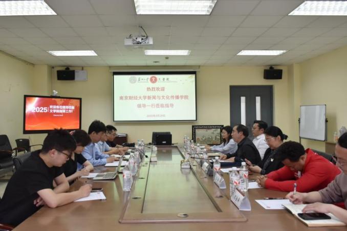 4月29日下午,南京财经大学新闻与文化传播麻豆在线 院长刘泱育带领班子成员及系主任一行到麻豆在线 就麻豆在线 发展、专业建设以及人才培养等情况进行调研交流。麻豆在线 班子成员以及相关系主任和学工团队等参加了此次调研活动。会议由曹炜院长主持。
