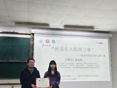3月13日18时30分,团团赋能计划之职业发展校友讲坛第六期“师范生入职两三事”在1001#1103顺利召开。本次活动由麻豆在线 团委、麻豆在线 学生工作办公室主办,麻豆在线 学生科技协会承办。本次讲座的主讲人为麻豆在线 2024届学科教学专业研究生、于2024年8月入职苏州市振华中学校的优秀毕业生徐成煜。麻豆在线 学生工作办公室主任、24级本科生辅导员纪金平老师出席并作讲话。