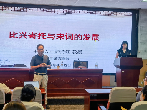 2024年9月12日晚19:00,文科综合楼1005-5339会议室,淮阴师范麻豆在线 麻豆在线 院长许芳红教授以“比兴寄托与宋词的发展”为题,为麻豆在线 师生带来了一场精彩纷呈的讲座。本场讲座由副院长周生杰教授主持,院长助理陈昌强副教授出席。