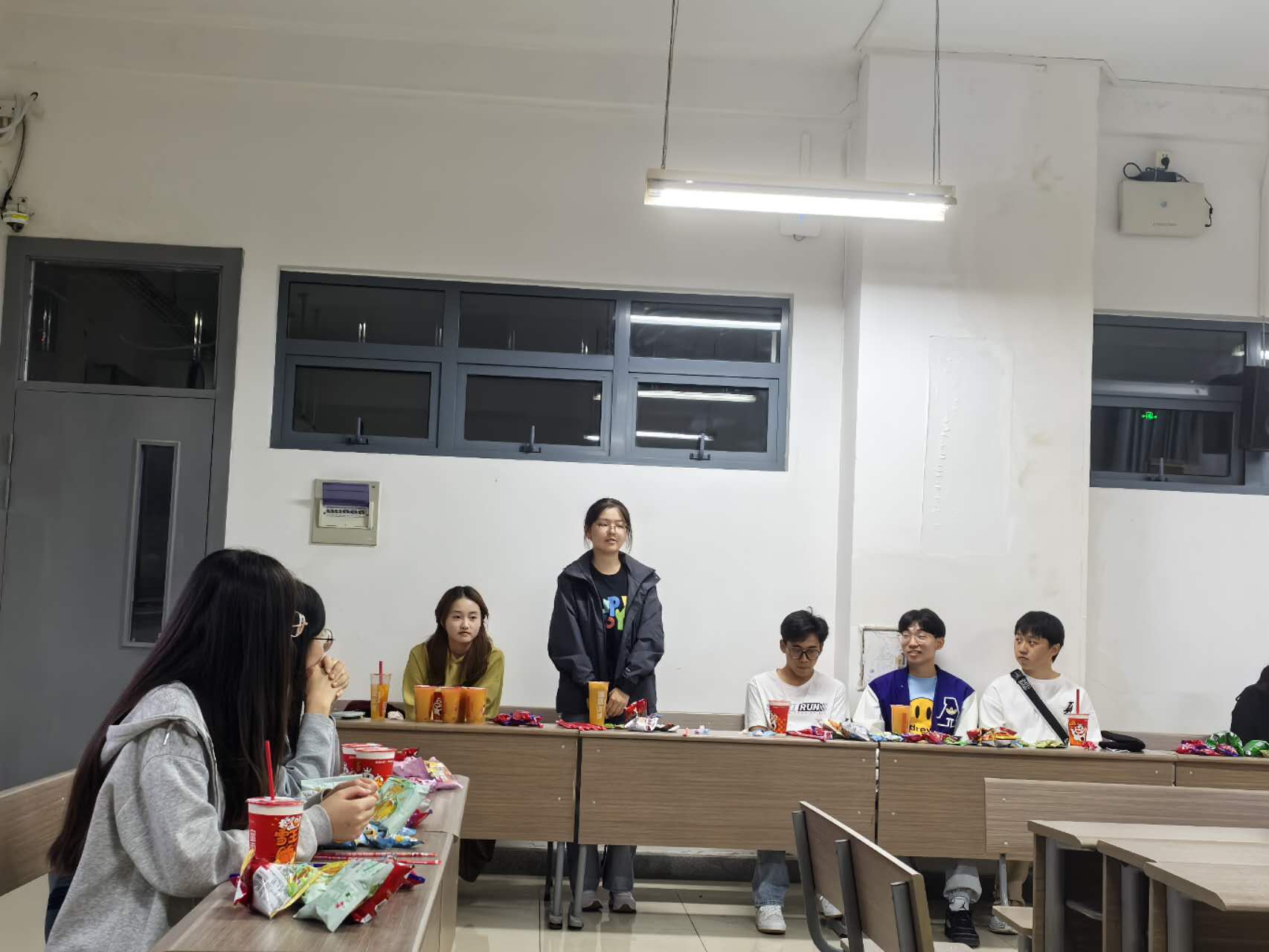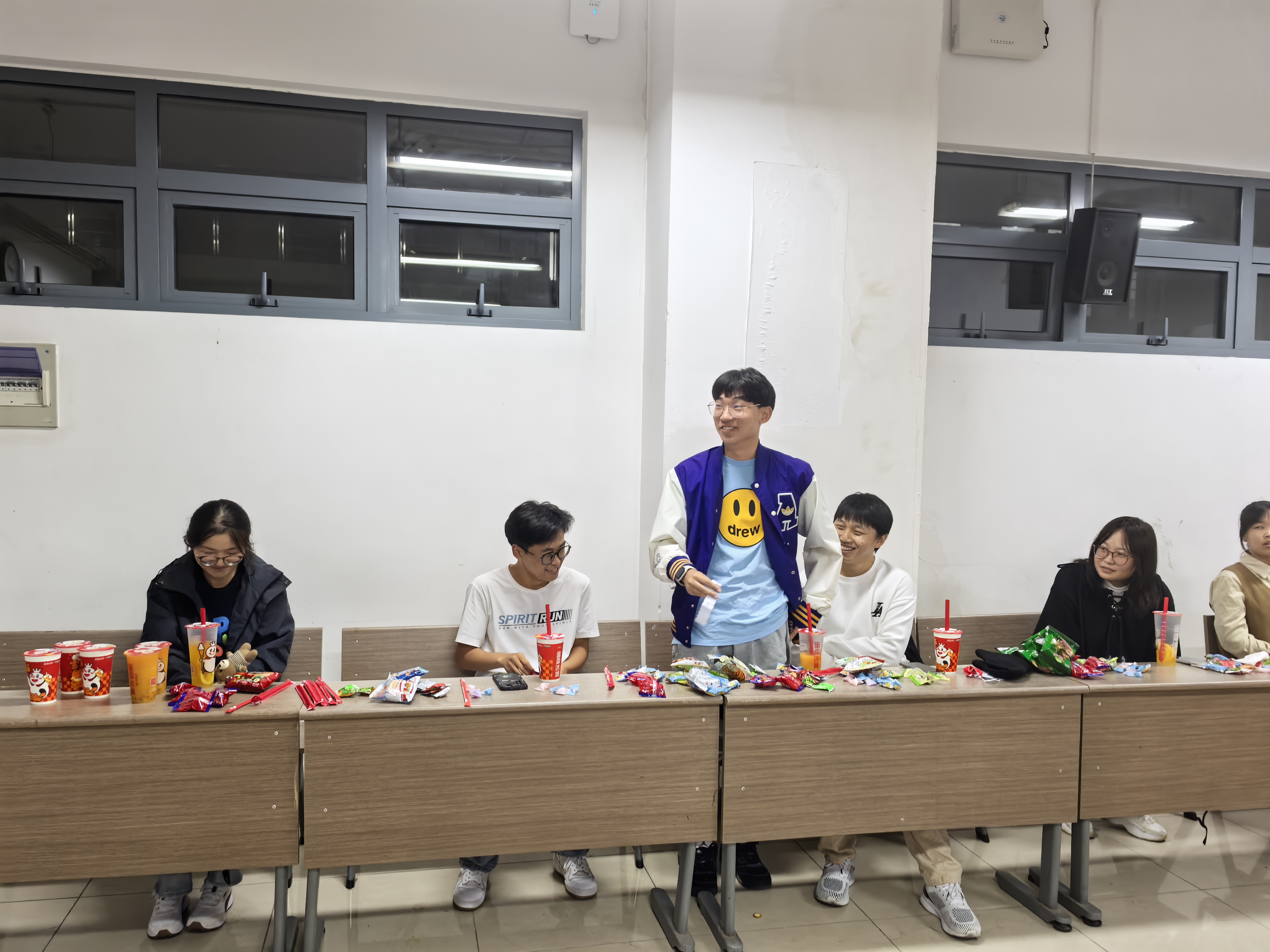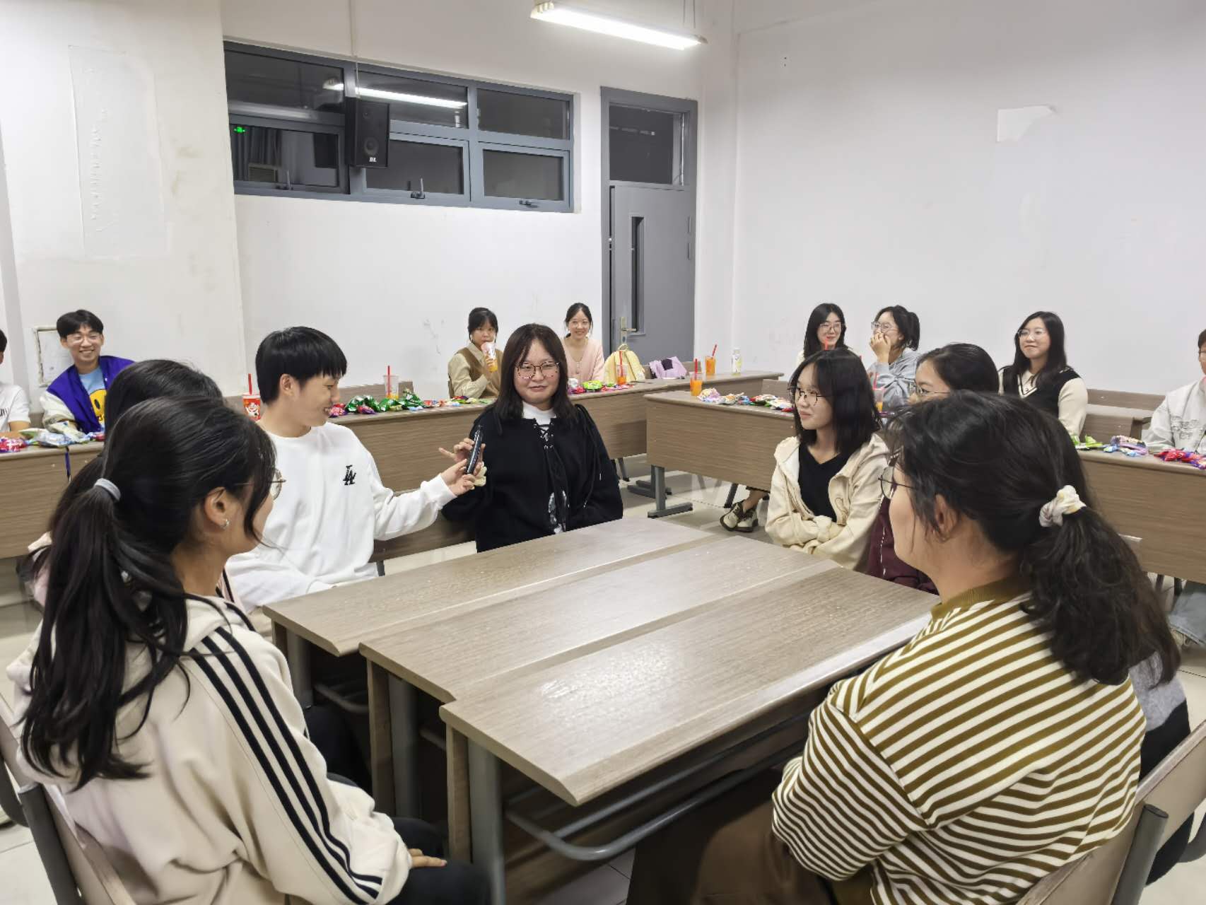 整个游戏互动环节中,同学们围坐在一起,分享零食,热切交流。在一片欢声笑语中,氛围热烈而和谐,整个活动洋溢着友好与团结的气息。