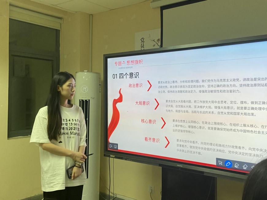 随后屠陈怡带领大家认真学习了习近平强调的教育强国的主要措施,她重点介绍了习近平新时代中国特色社会主义思想的“四个意识”,并对此强调“教育强国体系应当具有强大的思政引领力、人才竞争力、科技支撑力,为以中国式现代化全面推进强国建设、民族复兴伟业提供有力支撑”。