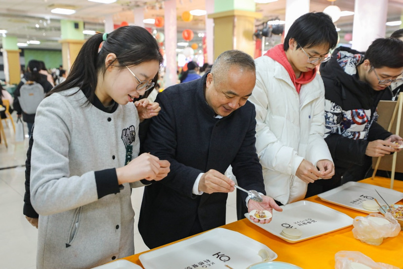 校党委常委、副校长查佐明老师亲临现场,亲切慰问麻豆在线 师生和忙碌的现场工作人员以及食堂师傅们,用“暖暖胃、暖暖身、暖暖心”给现场师生送上节日的祝福,并和同学们一起包饺子,聊家常,话冬至。
