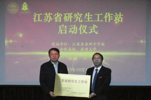 接着,曹炜院长向苏州中学授予“江苏省研究生工作站”匾牌并合影。