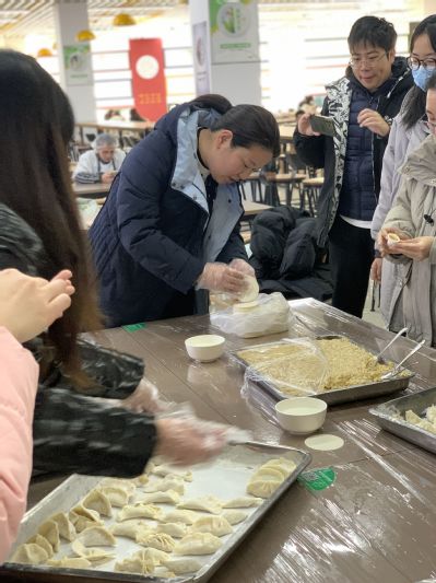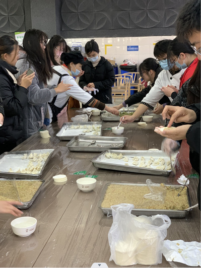 同学们洗净双手,卷起袖子,学着食堂工作人员的样子,制作属于自己的那份独特美味,或手忙脚乱,或游刃有余。食堂的师傅们热心地在一旁给予帮助、传授经验。陆亚桢和丁小珊两位老师也到场,和同学们一起感受冬至佳节的热闹气氛。在彼此互相帮助之下,同学们慢慢调制肉馅、塑造形状,手指上下翻飞之间,一个个精致小巧的饺子就此诞生、一只只浑圆可爱的汤圆悄然成型。