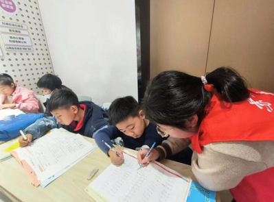 紧接着,七位志愿者按照“1对2”或“1对3”模式为孩子们进行作业辅导。在作业辅导过程中,志愿者遵循先详细了解孩子们的学习任务和学习进度,再针对其薄弱知识“对症下药”的步骤,帮助孩子们高效率地完成了学校布置的作业任务。