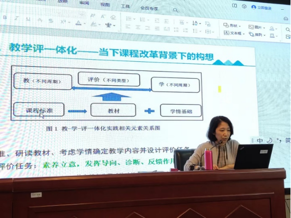 紧接着,叶教授将视角转向当下的课程改革大背景,提出在新课标引领下,“教-学-评一致性”成为了实现教学评一体化的关键。她强调要坚持素养立意,发挥好评价的导向、诊断、反馈作用。