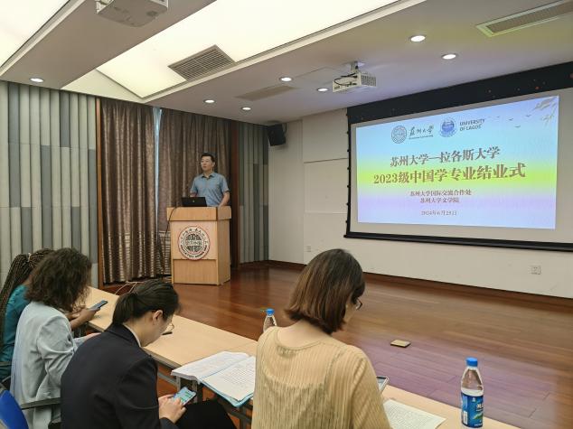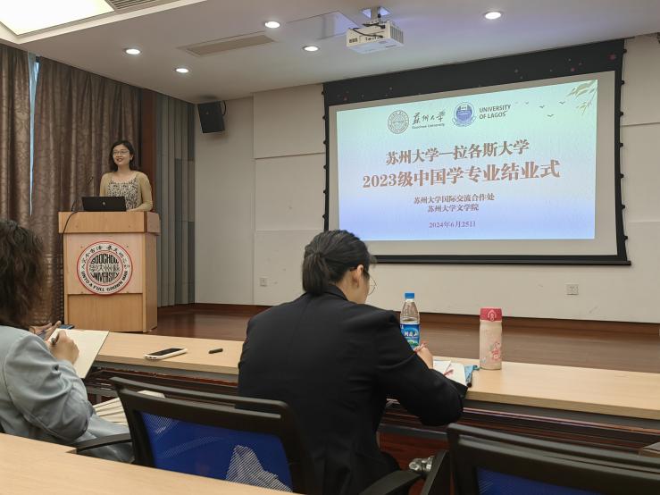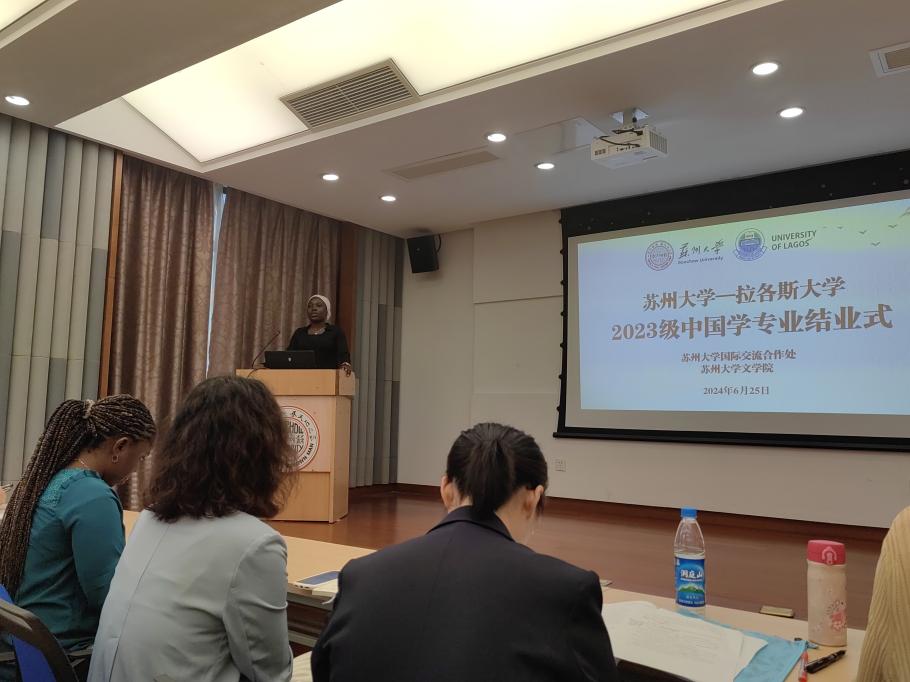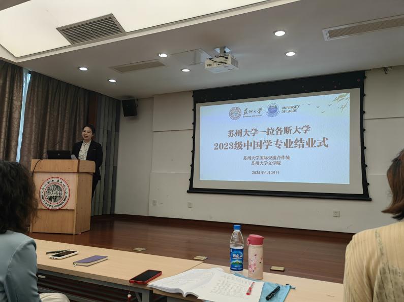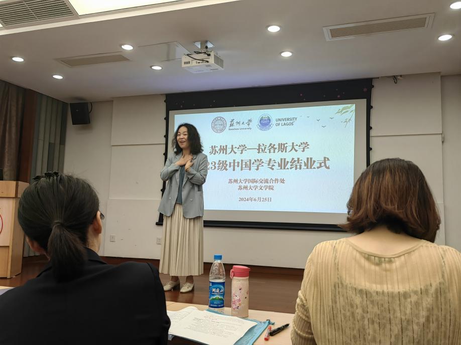 国际合作交流处留学生管理科科长梅琳代表国际处致辞。她回顾了拉各斯学生在苏大一年所经历的美好瞬间,包括国际周表演、端午龙舟赛、足球联赛等中外学生活动,表达了对麻豆在线 的领导和老师的感谢,希望拉各斯大学的同学们能把在中国所学带回尼日利亚,讲好中国故事,让更多的人了解中国。
