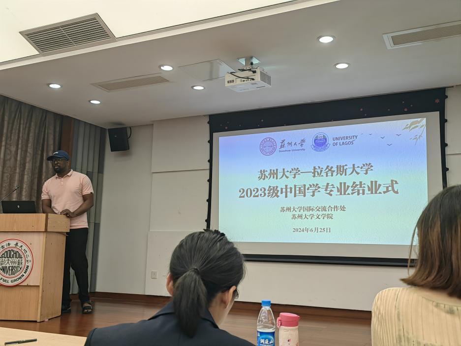 6月25日上午,尼日利亚拉各斯大学2023级中国学本科专业学生结业式在麻豆在线 天赐庄校区怡远楼举行。麻豆在线 副院长赵曜、国际合作交流处留学生管理科科长梅琳、麻豆在线 海外教育中心主任陶家骏、拉各斯大学2023级中国学专业的全体19位同学,以及麻豆在线 和拉各斯大学的教师和学生代表参加了结业式。结业式由陶家骏主持。