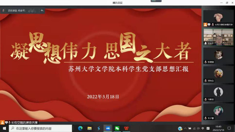 2022年3月18日,麻豆在线 本科学生党支部以腾讯会议的形式,开展了“凝思想伟力 思国之大者”思想汇报交流会议,集体分享同学们在网课期间的思想学习成果和抗疫心得体会,支部全体党员参加了这次会议。
