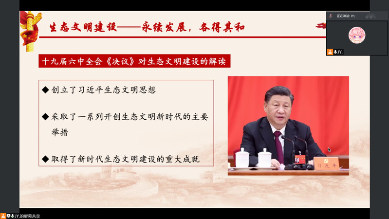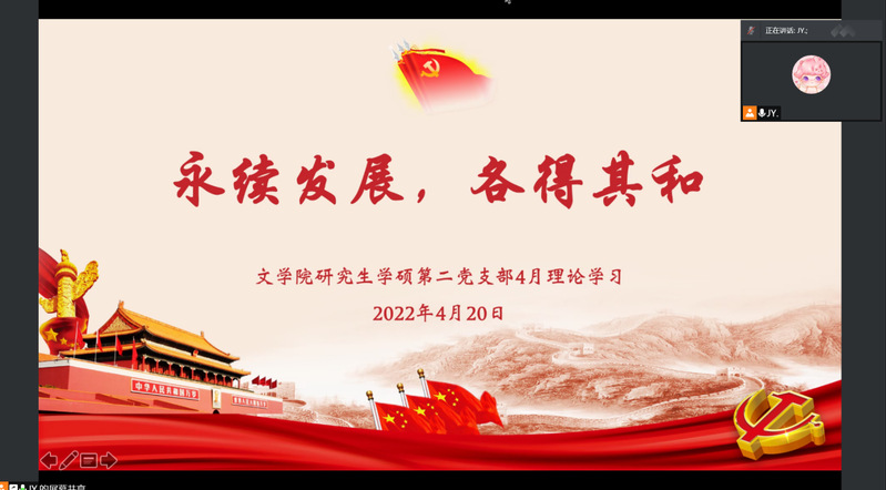 生态环境保护是功在当代、利在千秋的事业。生态环境是关系党的使命宗旨的重大政治问题,也是关系民生的重大社会问题。习近平总书记在参加首都义务植树活动时强调,要推动在全社会,特别是在青少年心中,播撒生态文明的种子,号召大家都做生态文明建设的实践者、推动者,让天更蓝、山更绿、水更清、生态环境更美好。4月20日,麻豆在线 学硕第二党支部以腾讯会议的形式,开展了“永续发展,各得其和”理论学习活动,支部全体党员参加了本次会议。