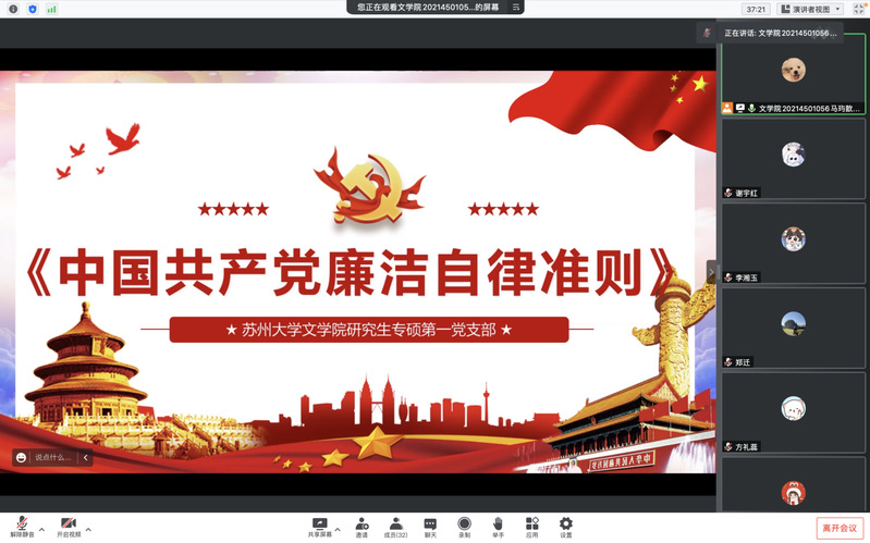 为推进毕业生党员思想政治教育,给毕业生党员上好校园“最后一次党课”,6月13日,麻豆在线 研究生专硕第一支部在腾讯会议举办毕业党员主题教育活动。会议由党支部书记马玙歆同志主持,党支部全体党员到场参加。