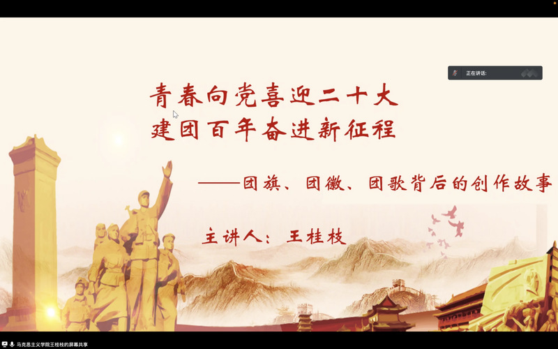 第二场则为“喜迎二十大、永远跟党走、奋进新征程”之百年团史青年学。该场由马克思主义学院的王桂枝同学主讲。王同学以“青春向党喜迎二十大,建团百年奋进新征程”为题,把团旗、团徽、团歌背后的创作故事向大家娓娓道来。