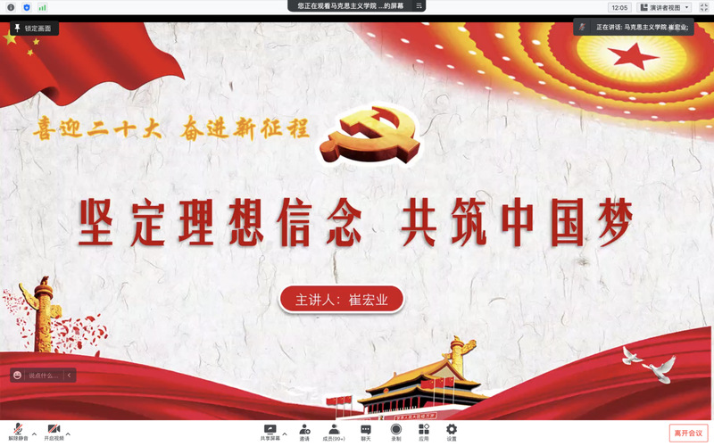 本次系列学习活动包括了两场联学。第一场为“喜迎二十大、永远跟党走、奋进新征程”之青年共联学。马克思主义学院的崔宏业同学以“坚定理想信念,共筑中国梦”为题进行宣讲。她针对“理想信念‘为何’”、“为何坚定理想信念”、“何以坚定理想信念”三个方面进行了细致讲解,并号召全体党员,为者常成,行者常至。只要我们胸怀党和人民,补足精神之钙、勇担青年使命、立志成长成才,从自己做起,从现在做起,就一定能乘着新时代的春风放飞青春梦想!