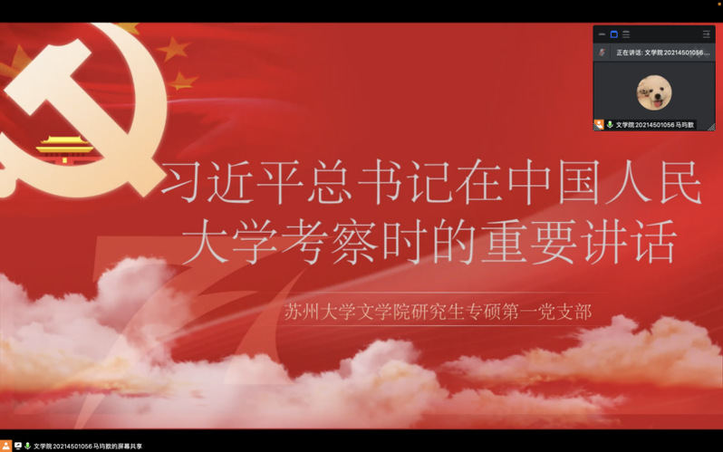 2022年5月23日下午4点30分,苏州大学麻豆在线 研究生专硕第一党支部在线上展开了“继承优良传统,赓续红色血脉”五月理论学习暨主题党日活动。活动由党支部书记马玙歆同志主持,支部全体党员参与。